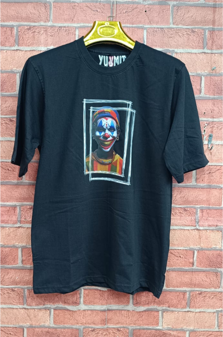 The T-shirt features a vivid clown illustration framed in a sketch-style border, creating a modern urban-art look that stands out instantly.